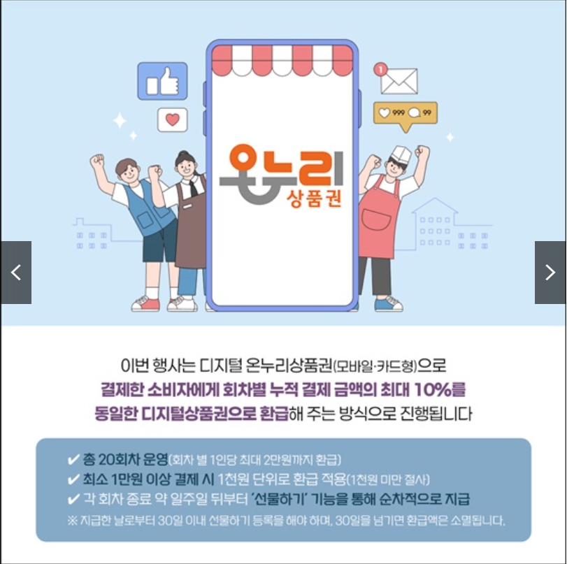 디지털 온누리상품권(모바일·카드형)으로 결제한 소비자에게 최대 10%를 동일한 디지털상품권으로 환급하는 혜택을 제공하여 소비자와 소상공인 모두에게 실질적 도움이 되는 제도입니다.