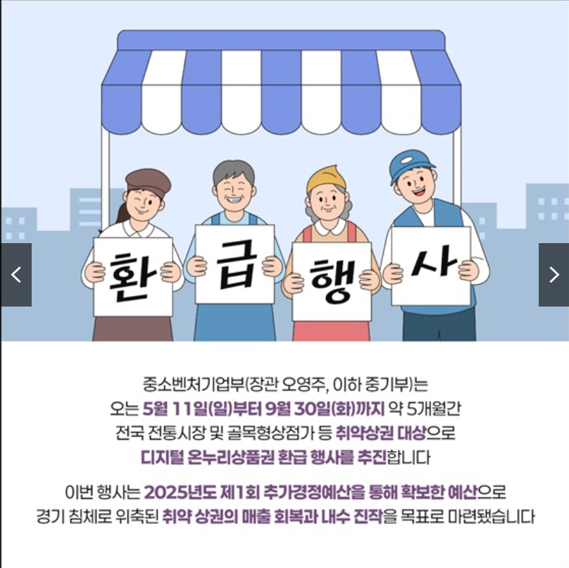 중소벤처기업부는 오는 2025년 5월 11일(일)부터 9월 30일(화)까지 약 5개월간 전국 전통시장 및 골목형상점가 등 취약 상권을 대상으로 디지털 온누리상품권 환급 행사를 추진합니다.