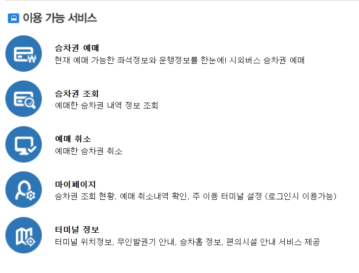 - 현장 예매: 터미널 내 매표창구 또는 무인 발권기를 통한 즉시 발권 가능